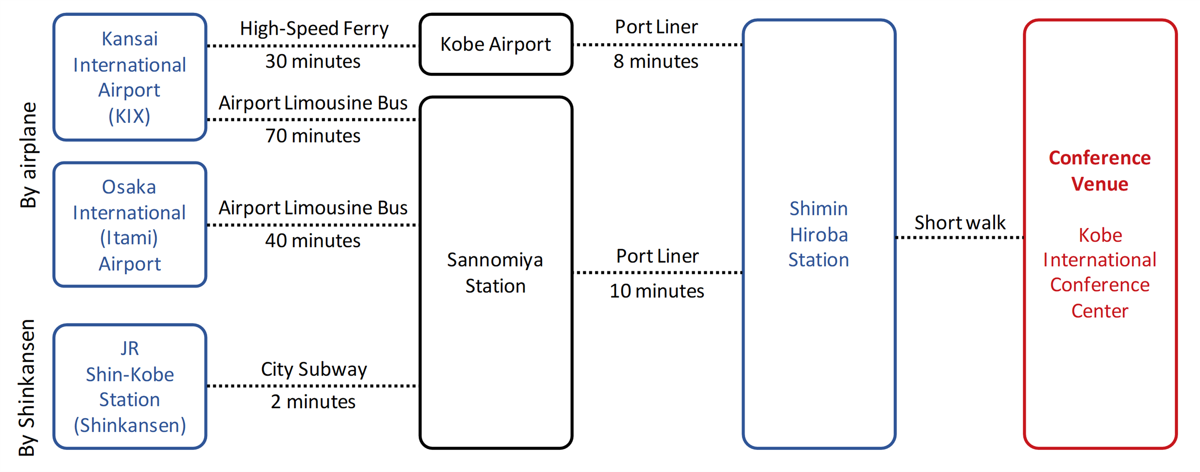 To reach the conference venue "Kobe International Conference Center," please get off at Shimin-Hiroba Station on the Port Liner.