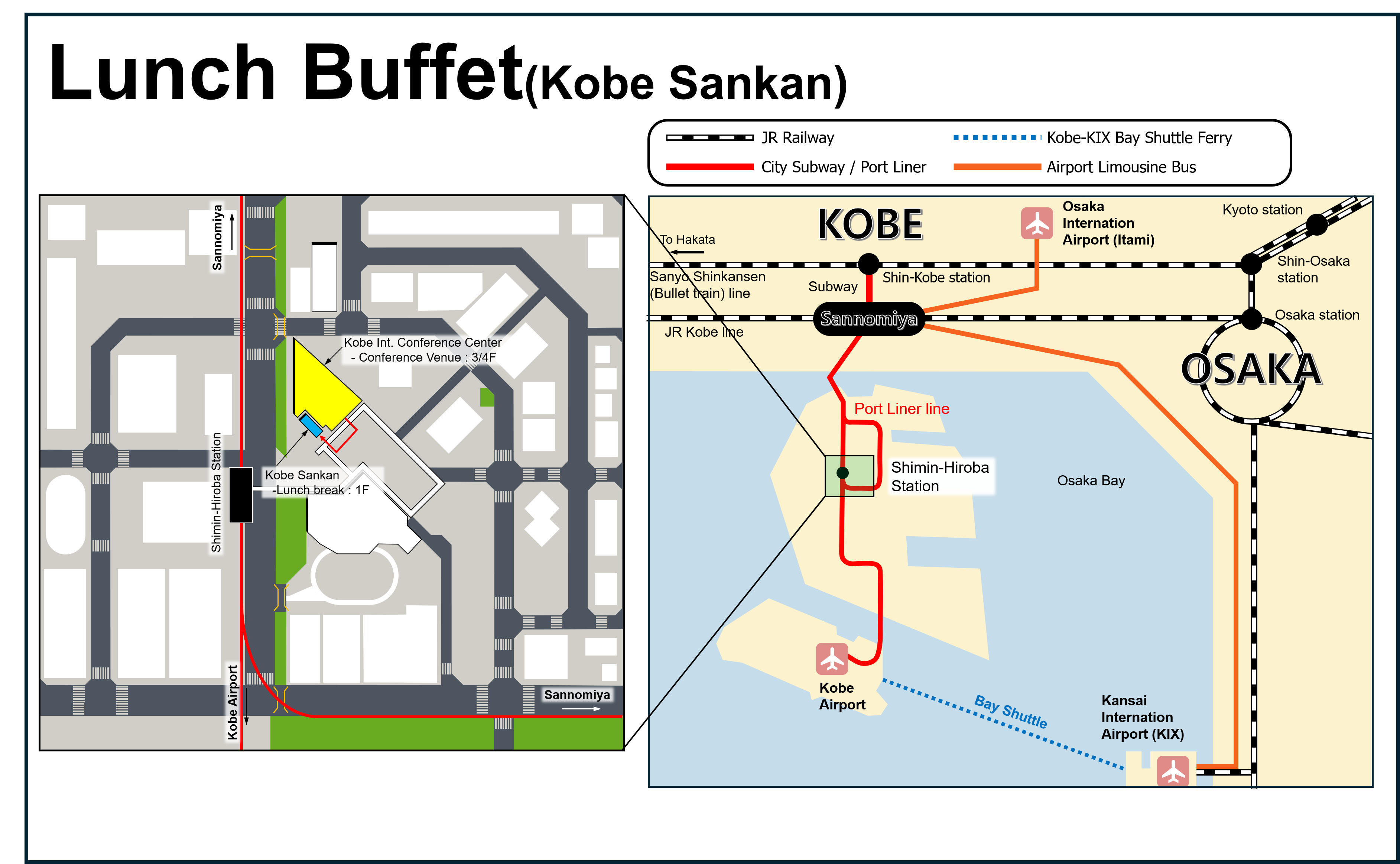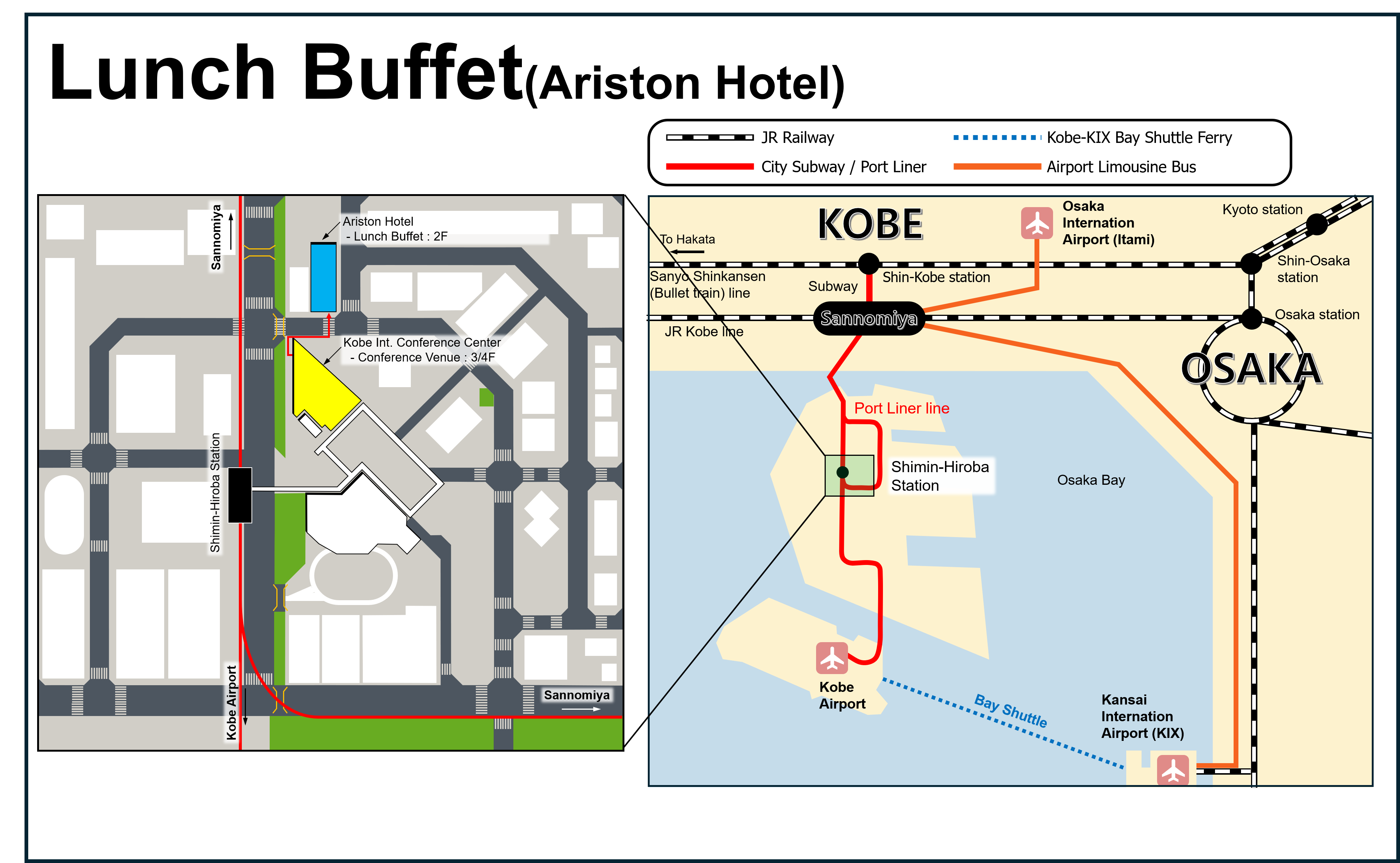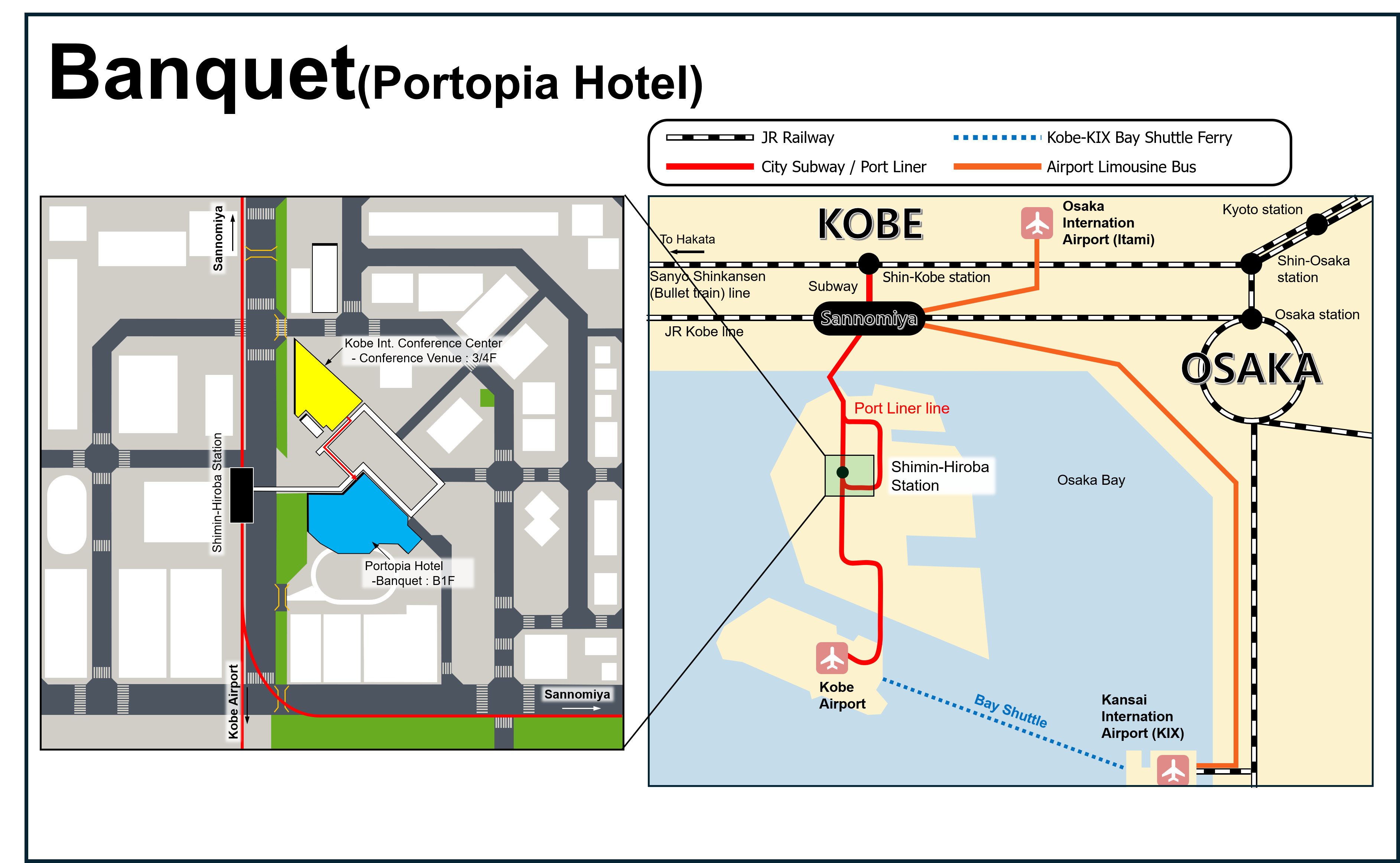 - Reception and Banquet: Weclome reception will be held at Ariston Hotel (15F, 16F; Access map) on Monday evening and Banquet will be held at Restaurant "Kairaku", Kobe Portopia Hotel (B1F; Access map) for dinner on Thursday.