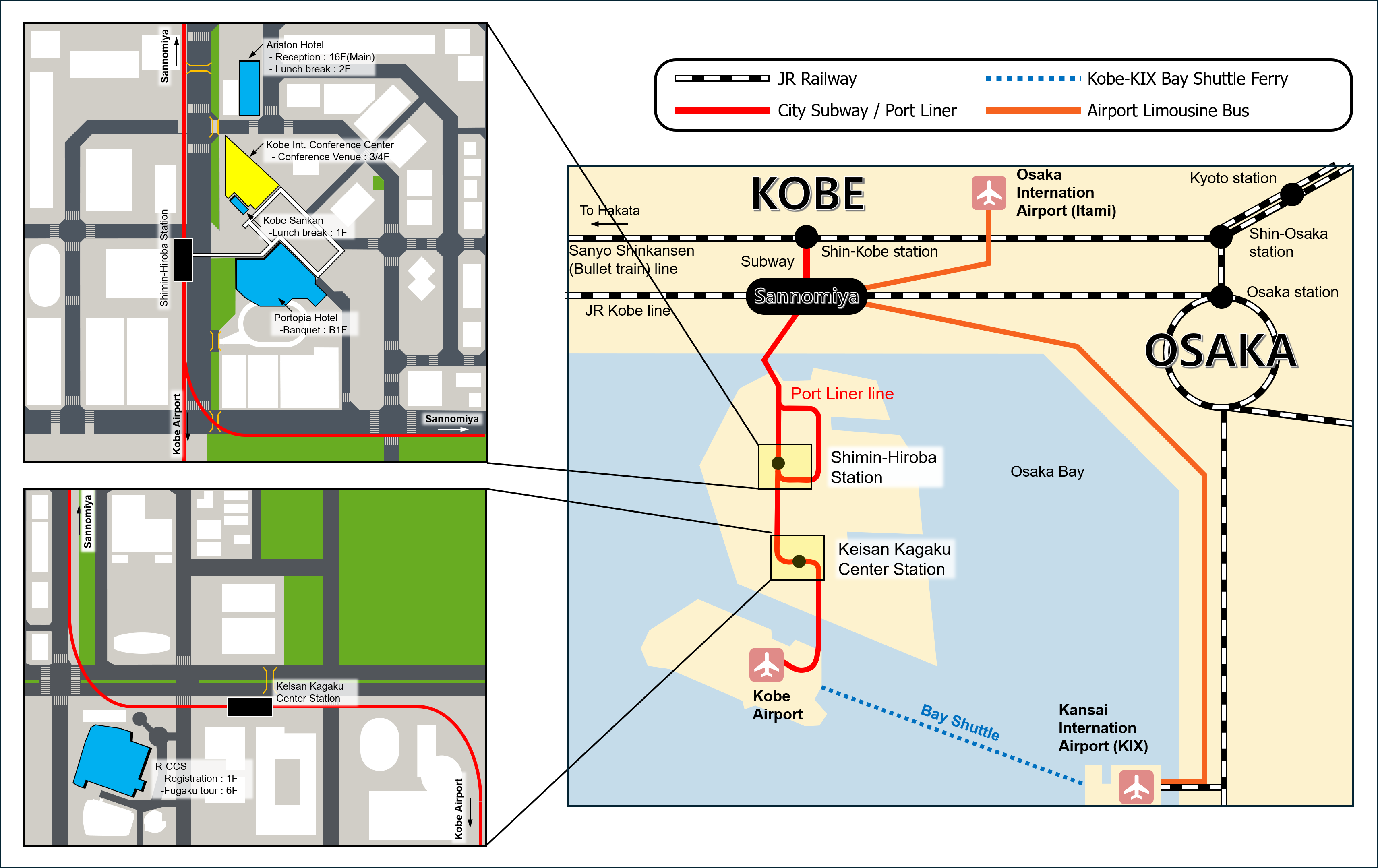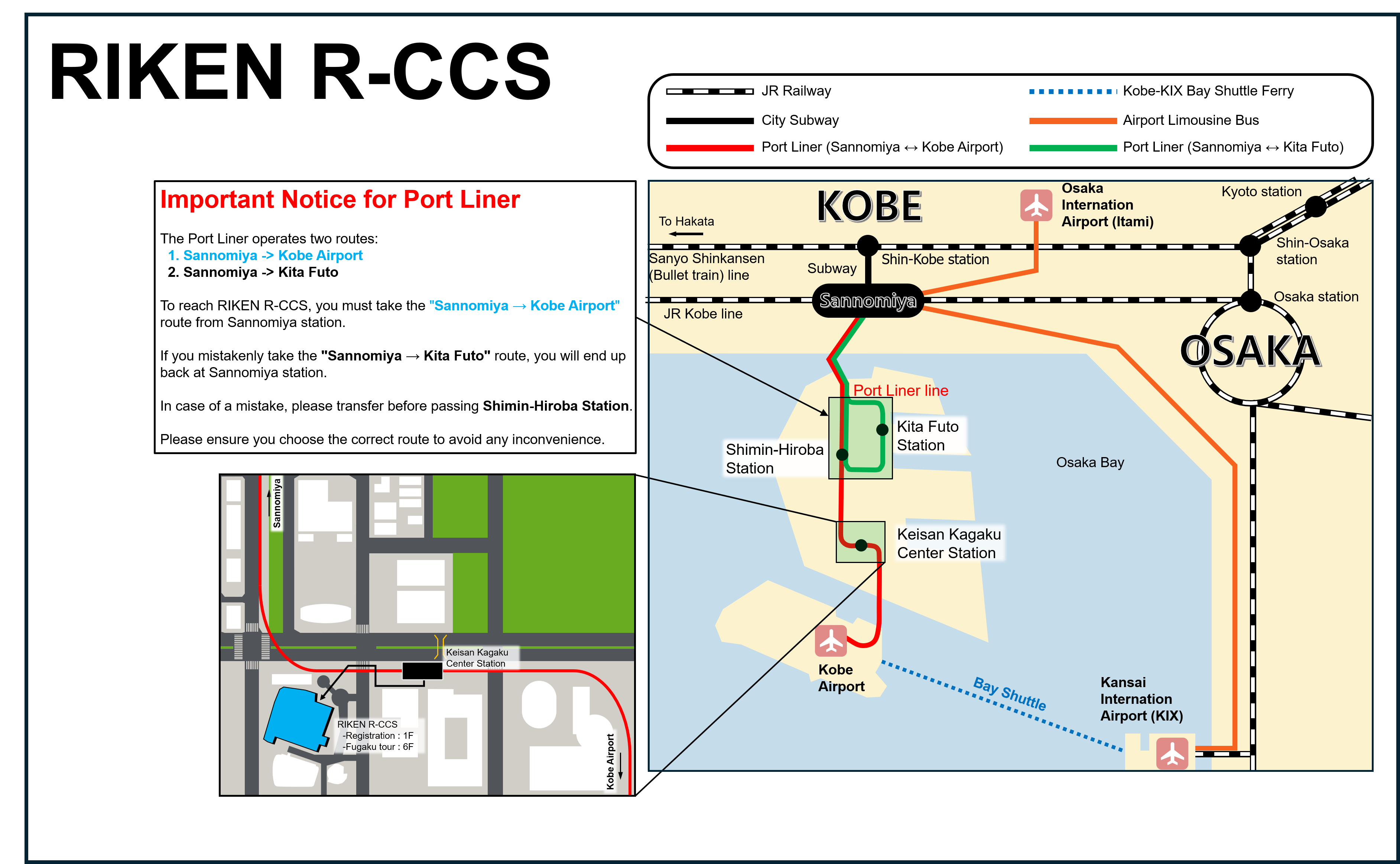 RIKEN R-CCS is located on Port Island, the same island as the conference venue. To reach the RIKEN R-CCS, please get off at the nearest station of the Portliner "Keisan Kagaku Center" and walk 5 minutes from the station.